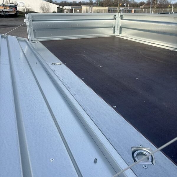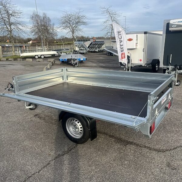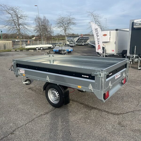Grâce à ses roues positionnées sous le plateau, elle offre une largeur de chargement optimale de 143 cm, idéale pour transporter des charges volumineuses. De plus, son essieu freiné de 1300 kg garantit une sécurité accrue lors des déplacements, même avec des charges lourdes.