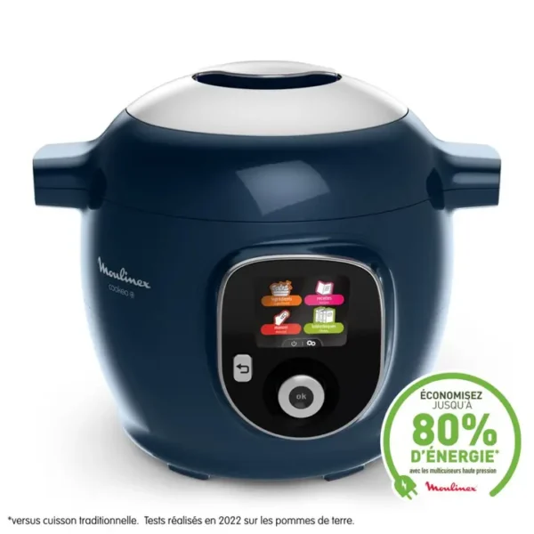 Le Cookeo+ 150 recettes Bleu est un multicuiseur intelligent qui appartient à la gamme des Cookeo de Moulinex. Comme les autres modèles, il permet de cuire sous pression, mijoter, dorer, cuire à la vapeur ou encore réchauffer les aliments.