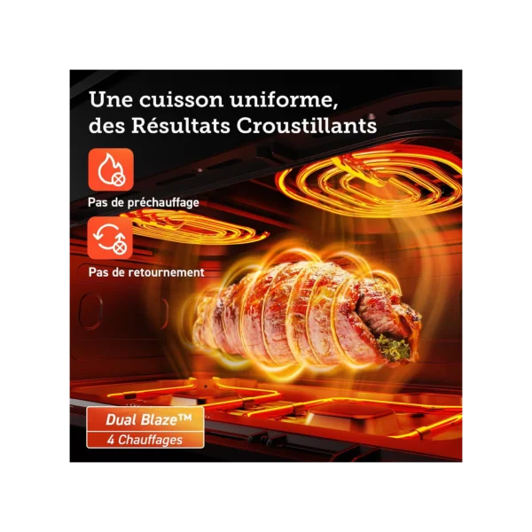 La friteuse sans huile COSORI Twinfry Chef Edition se distingue par sa technologie Dual Blaze à 4 résistances, garantissant une cuisson rapide et homogène sans préchauffage. Grâce à ses deux chauffages en haut et en bas, elle offre une polyvalence totale avec 6 modes de cuisson, permettant de préparer de l’entrée au dessert dans un seul appareil.