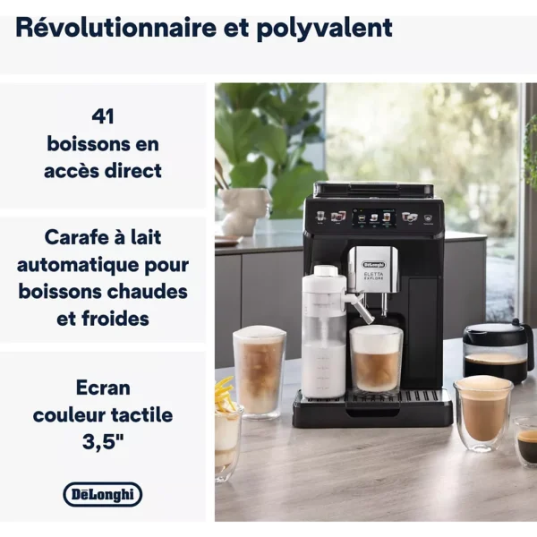 Grâce à cette double fonctionnalité, vous pouvez préparer vos recettes préférées à tout moment de la journée ou de l’année, sans avoir besoin d’appareils supplémentaires. Que ce soit pour un espresso simple, un latte gourmand ou un café glacé rafraîchissant, la Eletta Explore répond à toutes les envies.