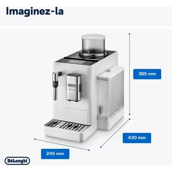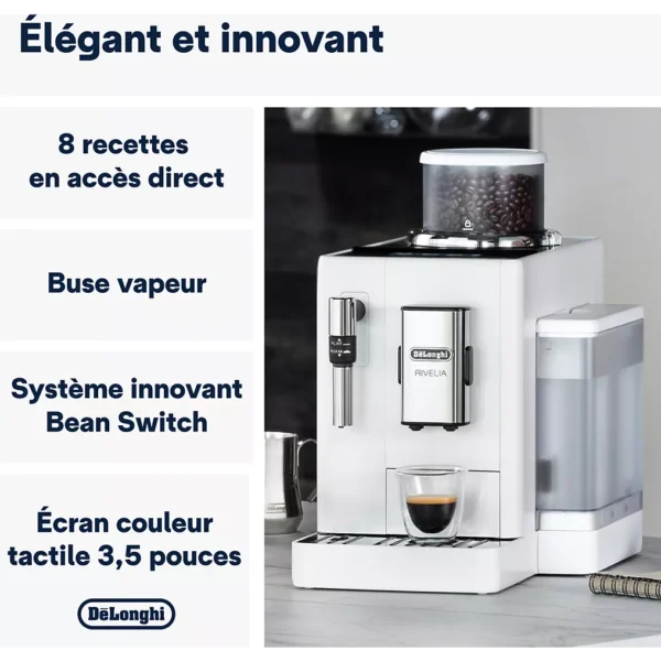 L’Expresso-Broyeur DeLonghi Rivelia FEB4435.W Blanche est une machine haut de gamme conçue pour offrir une expérience café personnalisée, moderne et intuitive. Grâce à son écran couleur interactif, son broyeur performant et son design raffiné en finition blanche, elle combine technologie, esthétique et confort d’utilisation.