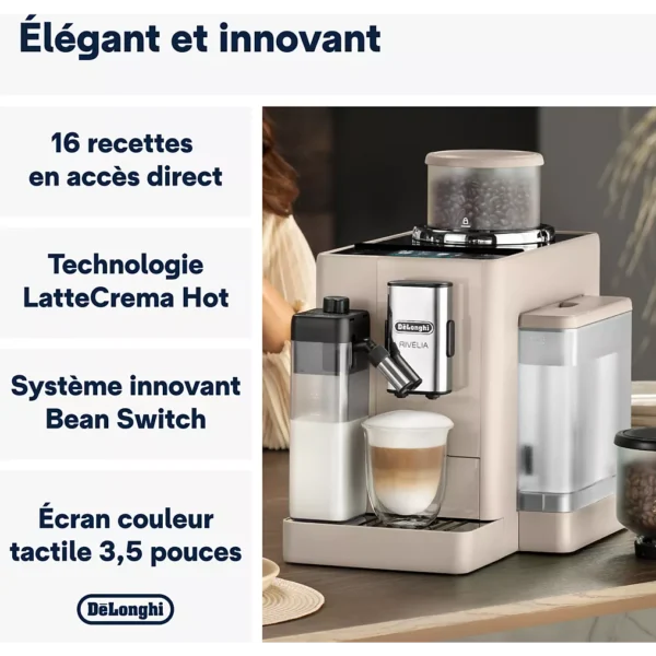 L’Expresso Broyeur DELONGHI FEB4455.BG Rivelia Latte Beige est une machine automatique nouvelle génération qui combine design élégant, technologie avancée et confort d’utilisation exceptionnel. Avec sa finition Latte Beige raffinée, son interface moderne, son broyeur performant et son système lait perfectionné, ce modèle s’adresse à tous ceux qui souhaitent profiter d’une expérience café premium directement à la maison.