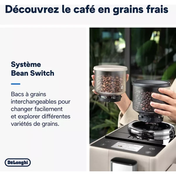 La gamme Rivelia introduit une innovation très appréciée : le Bean Switch, une fonctionnalité qui permet de changer facilement de variété de café en grain grâce à un système de bacs interchangeables.
