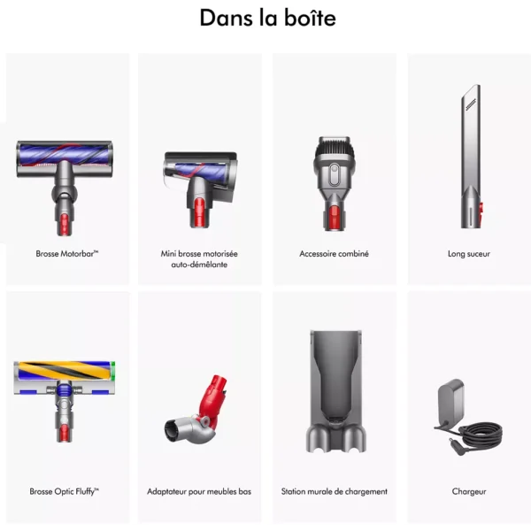 Le V12 ne se limite pas à un simple tube d’aspiration : il est livré avec une gamme complète d’accessoires qui élargissent considérablement ses capacités :