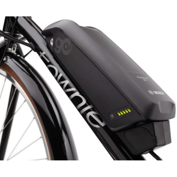 Le vélo est équipé d’une batterie Bosch PowerPack 500, d’une capacité de 500 Wh. Placée sur le tube diagonal ou le porte-bagages selon la version, elle est amovible pour un rechargement simple et rapide. Le temps de charge complet est d’environ 4,5 heures, mais une recharge partielle en deux heures suffit pour récupérer une grande partie de l’autonomie.