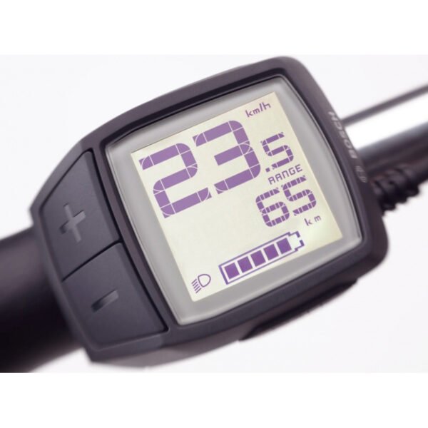 Un écran Bosch Intuvia, parfaitement lisible, affiche en permanence les informations essentielles : vitesse, distance, niveau d’assistance, autonomie restante et indicateur de charge. Son ergonomie intuitive permet de rester concentré sur la route sans se soucier de la gestion électrique.