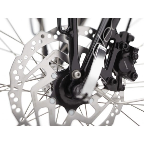 Côté freinage, le vélo est équipé de freins à disque hydrauliques Shimano. Ce type de frein garantit une puissance de freinage constante et fiable, quelles que soient les conditions météorologiques. Le cycliste bénéficie ainsi d’un contrôle optimal, que ce soit sur route sèche, mouillée ou glissante.