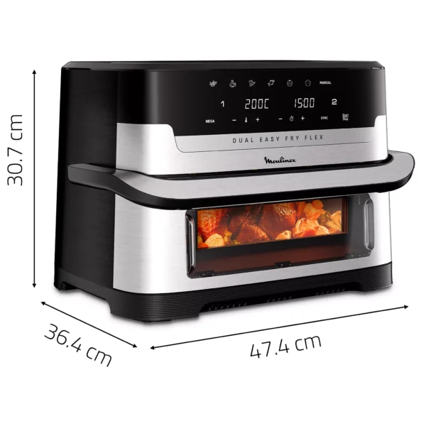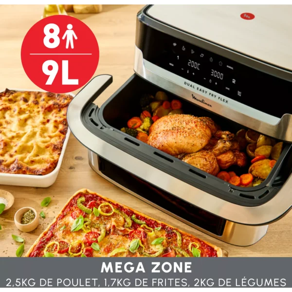 L’Easy Fry Dual Flex de Moulinex offre une flexibilité exceptionnelle avec ses deux zones de cuisson indépendantes ou sa méga zone de 9 litres. Grâce au séparateur amovible, vous pouvez passer facilement d’une double zone à une méga zone, idéale pour cuisiner des pièces volumineuses ou des plats en grande quantité tels que des lasagnes, des frites ou deux poulets entiers côte à côte. Cette polyvalence permet de préparer des repas complets pour jusqu’à huit personnes, rendant cet appareil indispensable pour les familles ou les repas entre amis.