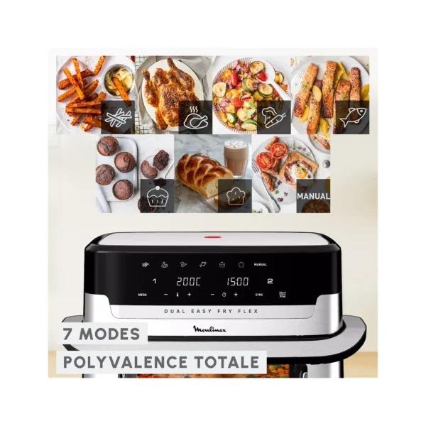 Ce air fryer est équipé de sept modes de cuisson automatiques intuitifs : Frites, poulet, légumes, poissons, desserts, levée de pâte, fonction manuelle pour laisser libre cours à votre créativité. Les réglages automatiques facilitent la préparation, et vous pouvez ajuster temps et température selon vos envies. En outre, l’Easy Fry Dual Flex permet d’économiser jusqu’à 70 % d’énergie, offrant une solution économique sans compromettre la performance (test réalisé en 2024 sur des frites surgelées).