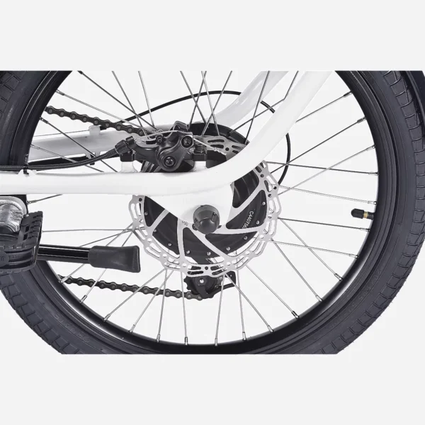 Le vélo repose sur des roues de 20 pouces, adaptées à la compacité du vélo pliant tout en offrant stabilité et maniabilité. Les pneus larges et crantés assurent une adhérence optimale sur routes asphaltées comme sur pistes légèrement accidentées, permettant un usage polyvalent et sécurisant. L’ensemble des composants de roulement est conçu pour réduire les frottements et garantir une longévité maximale.