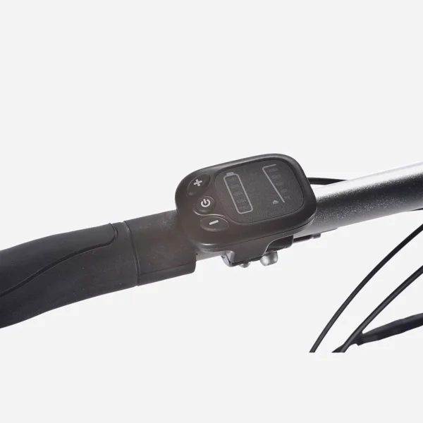 Le vélo possède une potence réglable en hauteur, une poignée tournante pour régler les 6 vitesses ainsi qu’un porte-bagage et d’un display LED.