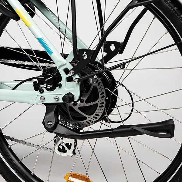 C’est un modèle de ville robuste et confortable, parfait pour les trajets du quotidien. Il est équipé d’une fourche suspendue. Le moteur dans la roue arrière apporte puissance et sensation de propulsion.