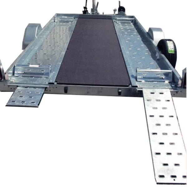 Pour répondre aux besoins spécifiques des utilisateurs, plusieurs options sont disponibles pour le porte-voiture Erdé XV1600. Un kit de basculement hydraulique peut remplacer les vérins à gaz, offrant une assistance supplémentaire lors du basculement de la remorque. Un plancher central en bois est proposé, permettant de transporter des véhicules aux dimensions particulières ou d’autres types de charges. Des rampes en acier de 1 mètre peuvent être intégrées, facilitant le chargement de véhicules à faible garde au sol. Un support pour roue de secours est disponible, assurant une solution rapide en cas de crevaison. Enfin, une roue de secours assortie peut être ajoutée pour une tranquillité d’esprit accrue lors des trajets.