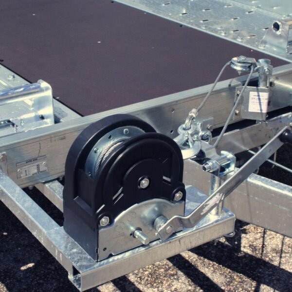 Le porte-voiture Erdé XV1600 est doté de plusieurs équipements de série visant à faciliter son utilisation et à garantir la sécurité du transport. Parmi ceux-ci, on trouve quatre anneaux d’arrimage intégrés au châssis, permettant une fixation sécurisée du véhicule transporté. Le bec de chargement fixe de 36 cm assure une transition en douceur lors du chargement et du déchargement. Deux vérins à gaz assistent le basculement de la remorque, simplifiant ainsi les opérations de chargement. Une roue jockey automatique de 60 mm de diamètre est incluse, facilitant les manœuvres et le stationnement de la remorque. Les rails de transport sont larges et dépourvus de rebords, ce qui est particulièrement avantageux pour les véhicules à voie étroite. Un treuil manuel avec support est fourni, offrant une assistance précieuse lors du chargement des véhicules non roulants. Enfin, deux cales de roue amovibles sont incluses pour sécuriser le véhicule pendant le transport.