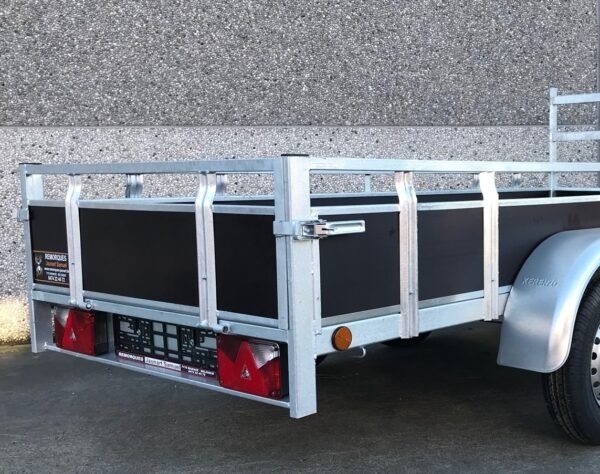 Cette Remorque 300×132 cm double essieux (dimensions extérieures) double essieux est pourvue de feux d’encombrement (de côté) et d’une série de feux à l’arrière (feux de position arrière, feux-stop, feux clignotants, …). Les feux d’encombrement (de côté) sont obligatoires à partir d’une largeur de plus de 115 cm. La remorque est équipée d’une prise à 7 broches.