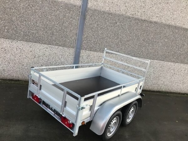 Cette Remorque aluminium double essieux 225×132 cm ou remorque 2 essieux (dimensions extérieures) en aluminium et double essieux est pourvue de feux d’encombrement (de côté) et d’une bande de feux à l’arrière (feux de position arrière, feux-stop, feux clignotants, …). Les feux d’encombrement (de côté) sont obligatoires à partir d’une largeur de plus de 115cm. La remorque est équipée d’une prise à 7 broches.