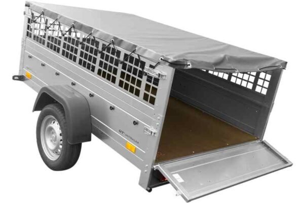 Grande remorque à benne basculante avec bâche plate grise, tiges de support bâche, ridelles grillagées et roue jockey du modèle Garden Trailer 201 KIPP. Grâce à la grande surface de transport de 200×125 cm, la remorque vous permettra de transporter de lourdes charges ou d’objets de grandes dimensions qui ne seraient normalement pas transportable dans votre voiture.