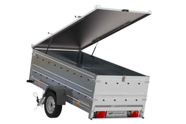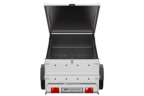 La bâche en aluminium pour remorque UNITRAILER GARDEN TRAILER 264 KIPP, d’un poids de seulement 62,14 kg, en alliage d’aluminium léger mais résistant (tôle d’aluminium de 3 mm d’épaisseur), protégera efficacement les marchandises transportées. Équipé de doubles renforts sur les côtés, qui garantissent une position stable sur les côtés et rigidifient en outre la structure. Au-dessus du couvercle se trouvent des rails sur lesquels vous pouvez placer une galerie de toit ou un porte-vélos, gagnant ainsi encore plus d’espace pour transporter différents types d’articles.