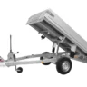 Remorque benne Basic équipée de série de ridelles alu de 30 cm, d’un plancher bois bien soutenu et d’une roue jockey.