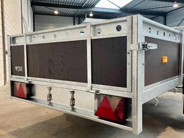 Cette Remorque double essieux 257×132 cm (dimensions extérieures) simple essieu est pourvue de feux d’encombrement (de côté) et d’une série de feux à l’arrière (feux de position arrière, feux-stop, feux clignotants,…). Les feux d’encombrement (de côté) sont obligatoires à partir d’une largeur de plus de 115 cm. La remorque est équipée d’une prise à 7 broches.