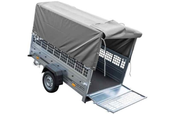 Grande remorque bâchée d’occasion à benne basculante avec bâche haute bleue, rehausses de ridelles grillagées et roue jockey du modèle Garden Trailer 230 KIPP. Grâce à la grande surface de transport de 230×125 cm, la remorque vous permettra de transporter de lourdes charges ou d’objets de grandes dimensions qui ne seraient normalement pas transportables dans votre voiture.
