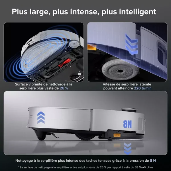 - Puissance d’aspiration : 22 000 Pascals – Hauteur du robot : 7,98 cm