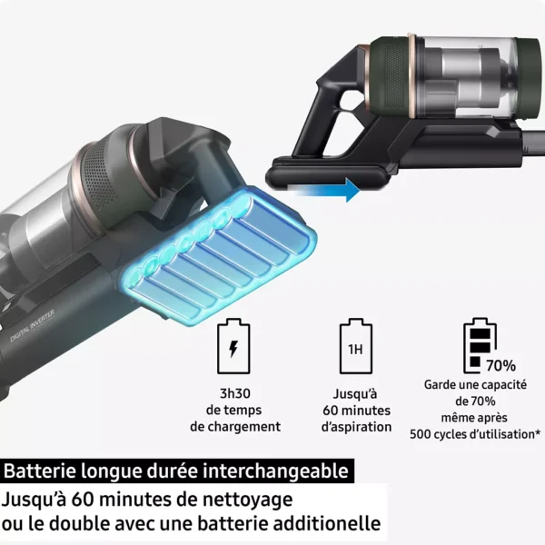 La batterie amovible permet d’en ajouter une seconde pour doubler l’autonomie si besoin. Ce système flexible convient parfaitement aux maisons spacieuses et aux foyers actifs où les séances de nettoyage doivent être rapides mais efficaces.