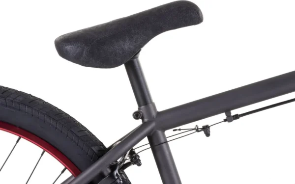 Les composants visibles comme les pédales, câbles et poignées s’intègrent parfaitement au style général. Ce vélo allie fonctionnalité et look streetwear, apprécié par les jeunes riders.