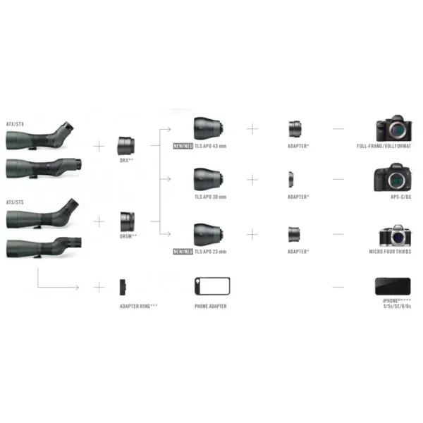 Le SWAROVSKI TLS APO 30 mm + DRX pour ATX et STX est un adaptateur haut de gamme pour digiscopie. Conçu par Swarovski Optik, il garantit une qualité d’image exceptionnelle. Il se fixe parfaitement aux longues-vues ATX et STX de la marque. Le TLS APO est compatible avec les appareils photo hybrides ou reflex.