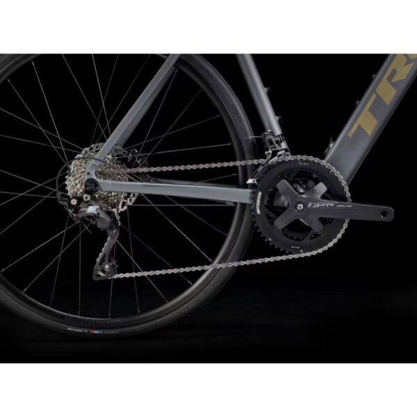 La fourche carbone Domane+ vient compléter cet ensemble. Elle allège la structure à l’avant et filtre efficacement les irrégularités de la chaussée. Cette combinaison aluminium + carbone permet de réduire le poids total du vélo tout en garantissant une direction précise et un excellent contrôle à haute vitesse.
