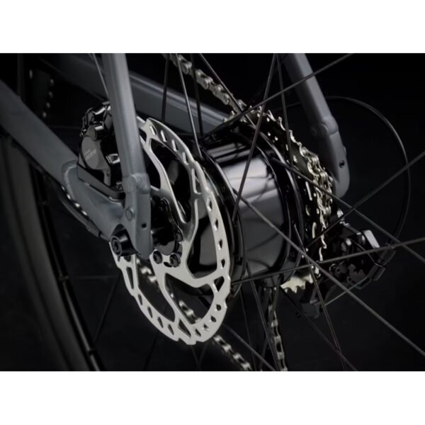 Côté freinage, Trek équipe son Domane+ AL 5 de freins à disque hydrauliques Shimano. Ces freins offrent une puissance de décélération constante et modulable, quelles que soient les conditions météo. Sous la pluie, en descente ou dans les virages serrés, le freinage reste précis et rassurant.