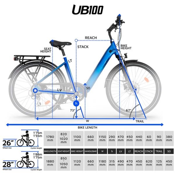 Le VAE de ville UrbanBiker UB100B dispose d’un cadre bas en aluminium robuste. Cette conception facilite l’accès et la descente, même pour les cyclistes portant des sacs ou ayant une mobilité réduite. La potence réglable et la selle ergonomique assurent une position confortable. Le cadre bas du UB100B renforce également la maniabilité et la sécurité lors des arrêts fréquents en ville.