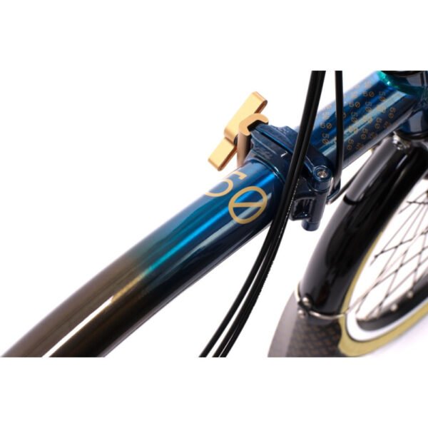 Tubes en acier traités thermiquement brasés à la main avec joints auto-soudés (cadre avant), tubes en acier micro-allié brasés à la main (cadre arrière Advance), manettes de serrage Gold, bloc de fixation pour bagagerie Brompton