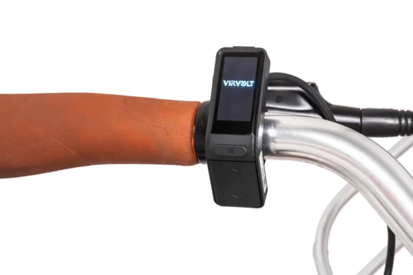 Moteur pédalier débrayable du kit Add-e, pèse seulement 2 kg. L’assistance est délivrée via un rouleau dont la bande de roulement vient en contact avec le pneu arrière. Un écran de contrôle proposant 5 niveaux d’assistance.