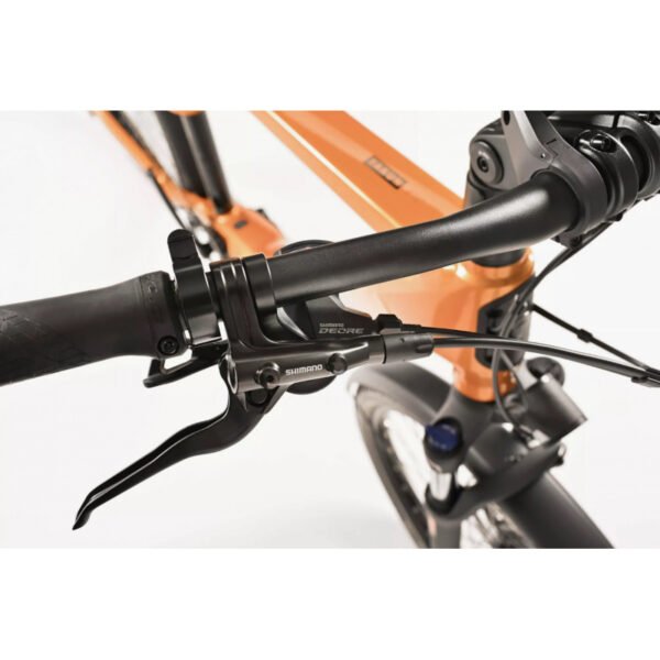 Le système de freinage hydraulique à disques Magura MT5 assure une puissance et une constance de freinage exceptionnelles. Les disques de 203 mm garantissent un contrôle précis même lors des descentes prolongées ou sous la pluie.